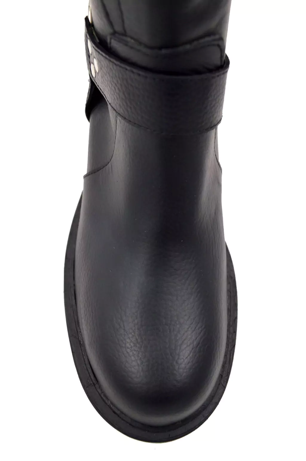 Bota de cuero de caña media con diseño robusto y detalles metálicos. Cuenta con tres hebillas decorativas en el lateral externo que realzan su estética y un cierre lateral interno que facilita su calce. La base con suela dentada ofrece excelente tracción y resistencia, ideal para el uso urbano y cotidiano.